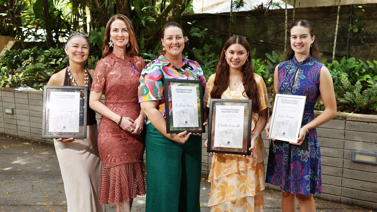 Shelly Langford pictured alongside Cairns Mayor Amy Eden and other winners of the 2025 Cairns International Womens Day Awards. Image: THE CAIRNS POST.